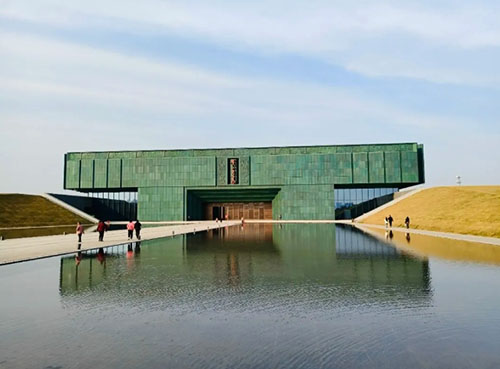 殷墟博物馆位于河南安阳市洹河北岸,外观是依据“鼎”元素演变而来的,是殷墟国家考古遗址公园的核心工程、灵魂工程。博物馆展览注重透物见人、注重多元融合、注重凸显故事趣味、注重增强沉浸体验,充分展示辉煌灿烂商文明。